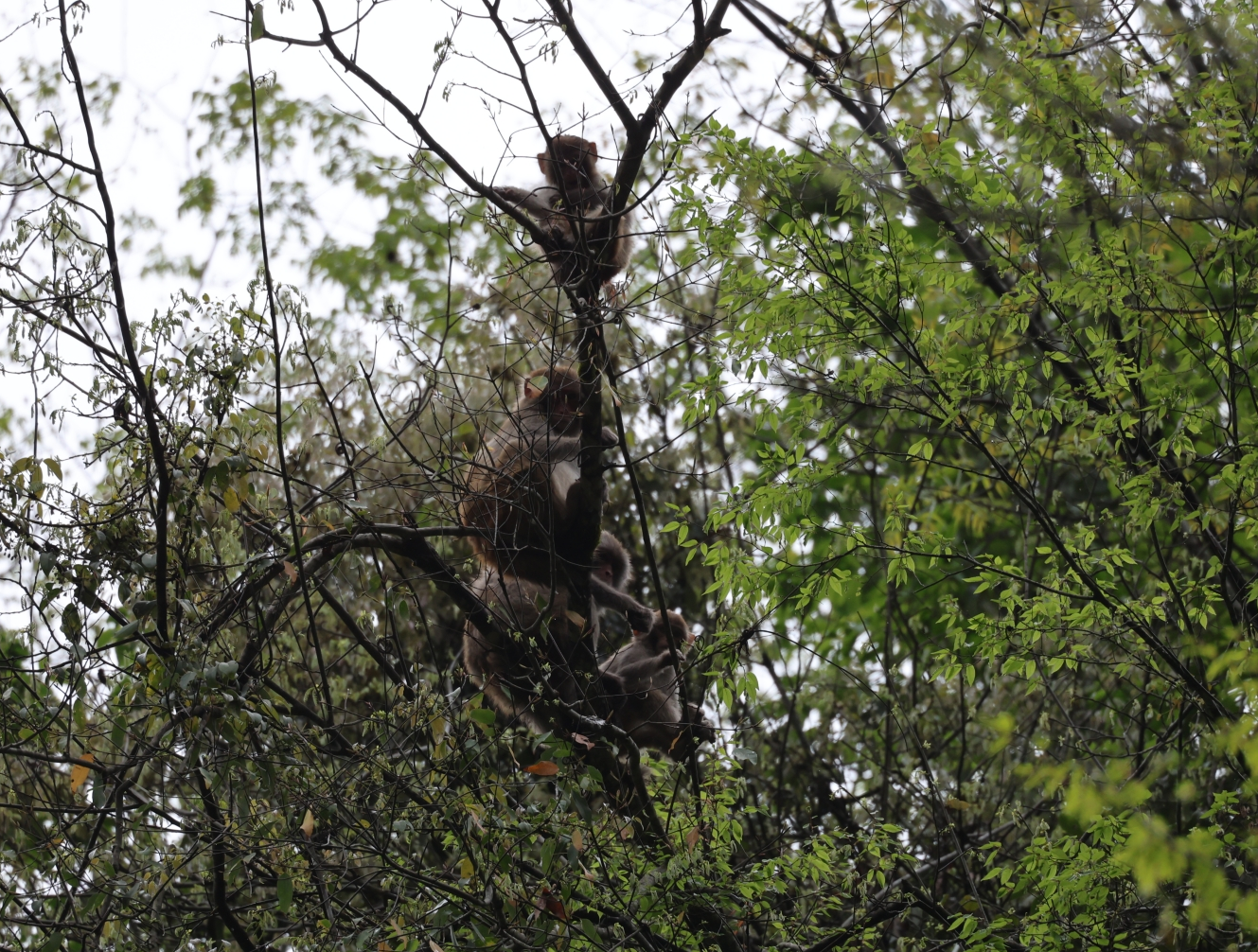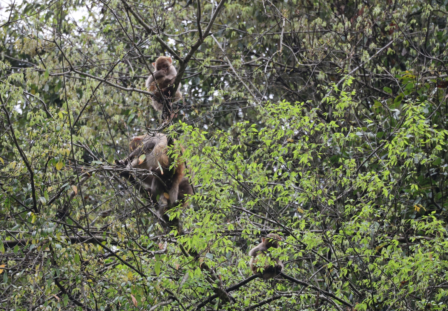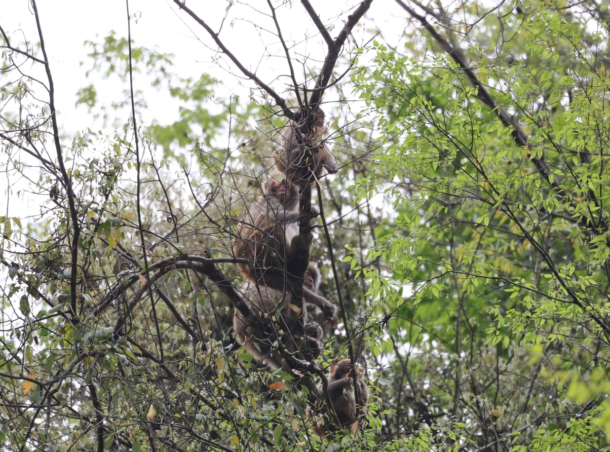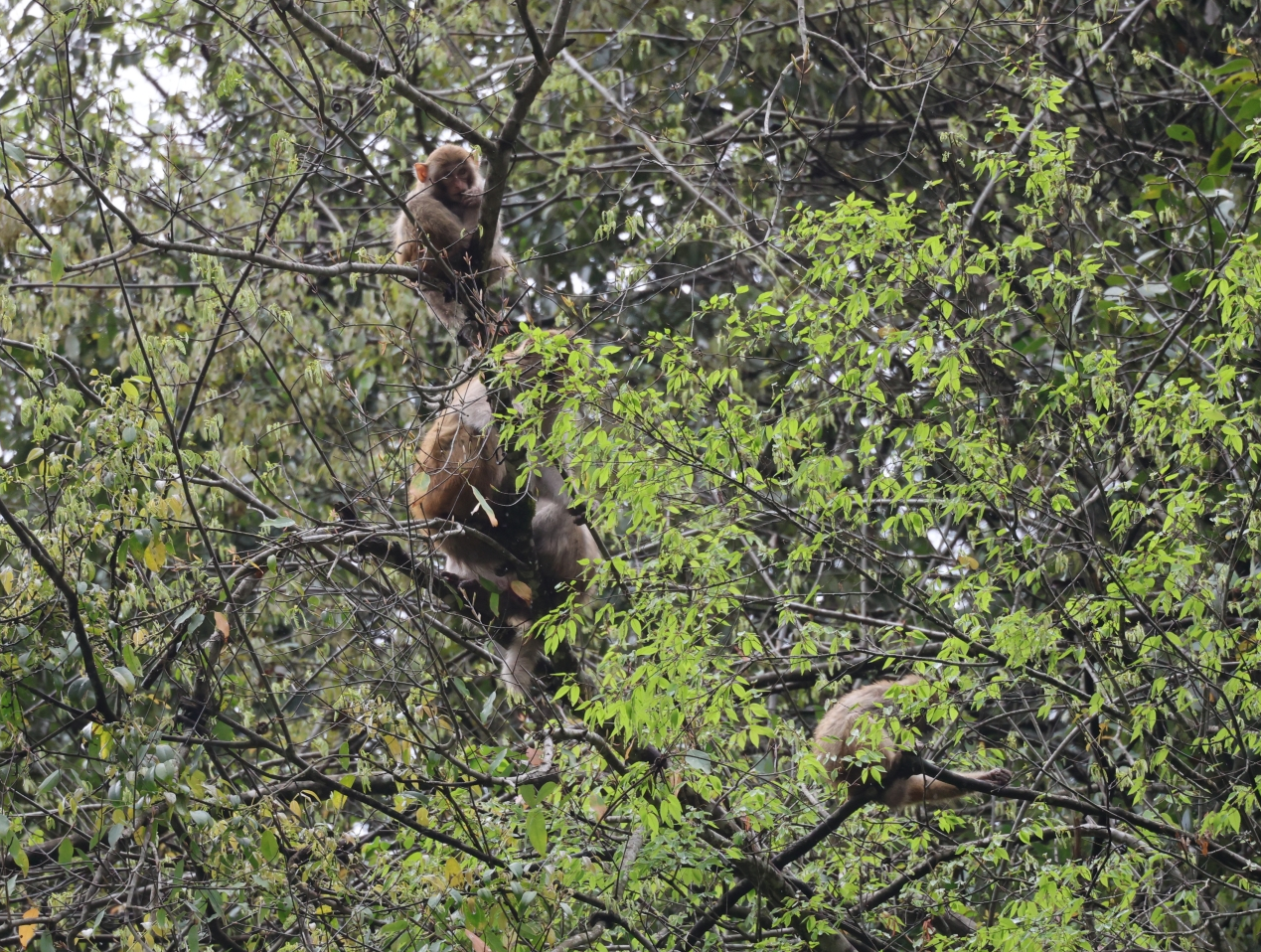 當時,天空正飄著綿綿細雨,濕潤的空氣裹挾著草木清香,山林更顯清幽靜謐。畫面中,4只獼猴在枝頭靈活穿梭、悠然活動,經(jīng)保護區(qū)確認是完整的一家四口。它們或攀附樹干采食嫩芽和野果,或靜立枝頭任由細雨輕拂,靈動身影在綠葉間躍動,與春日山林融為一體,洋溢著原生態(tài)野趣。