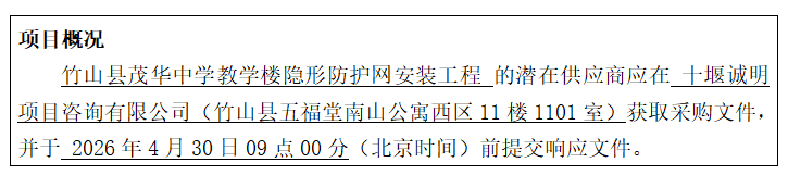 2、項(xiàng)目名稱:竹山縣茂華中學(xué)教學(xué)樓隱形防護(hù)網(wǎng)安裝工程